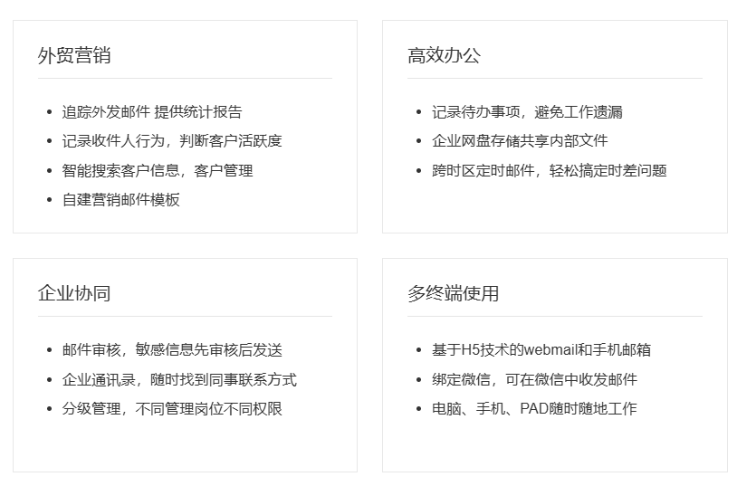 • 提高团队协作效率:该邮箱支持创建团队邮件组,如销售团队、财务团队等可以拥有各自的邮件组,相关成员自动订阅群组邮箱。管理者可一键发信给组员,项目组人员调整时也无需逐个通知,大大简化了信息传递流程,提高了沟通效率。同时,邮箱内置日历和会议邀请功能,团队成员可以共享日程安排、设置会议提醒,避免重要事项遗漏,还能进行任务协同和进度同步,让多人项目能够顺利推进,不会因为沟通不到位而出现延误或重复劳动。